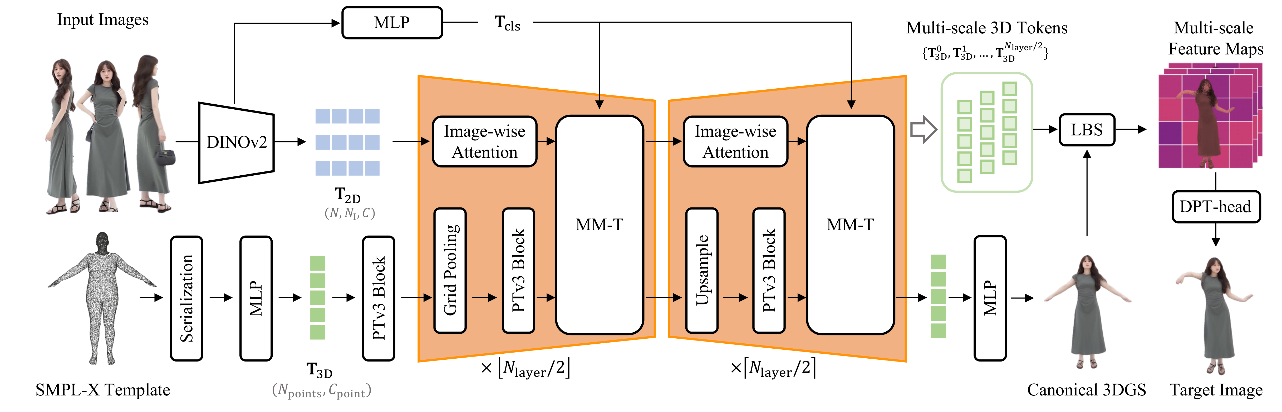 Overview of the proposed LHM++. In 2D space, we extract image tokens T2D from input RGB images by DINOv2. In 3D space, geometric tokens T3D are derived from SMPL-X anchor points via an MLP.