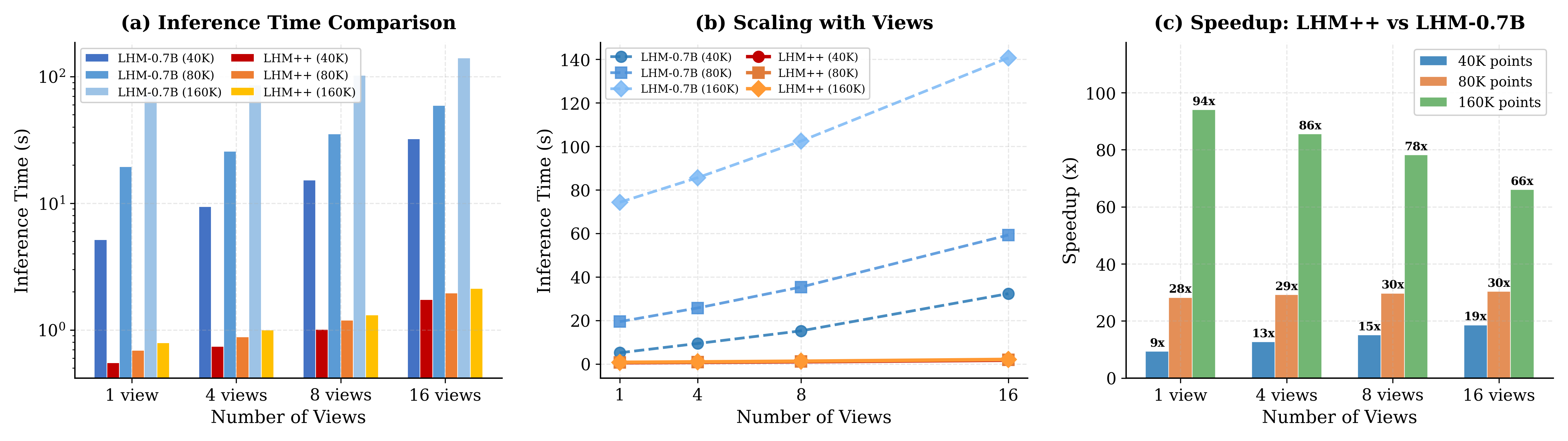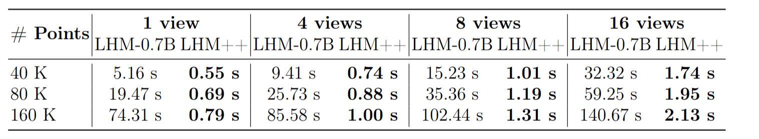 Thanks to the proposed Encoder-Decoder Point-Image Transformer, LHM++ achieves dramatic speedups over LHM-0.7B across all configurations. As shown below, LHM++ reconstructs a 160K-point avatar from a single image in under 0.79 s, compared to 74.31 s for LHM-0.7B — a 94× speedup. Even with 16 input views, LHM++ completes inference in only 2.13 s, making it highly practical for real-time applications.